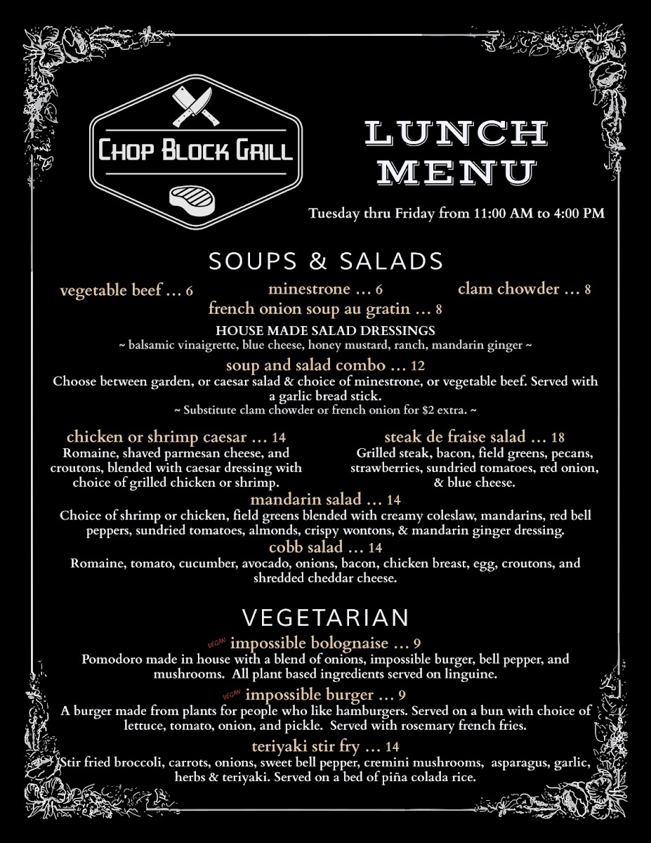 With attentive staff and a full bar, Chop Block Grill combines exceptional service with reasonably priced, expertly crafted dishes. Whether you're a local or just passing through, this restaurant promises a memorable dining experience that you won't soon forget.
